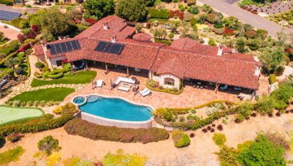 A custom gated Santa Barbara style estate unlike any other in the gate guarded community of Santa Luz with its unobstructed panoramic ocean views as well as views to Mexico and Catalina and the back country. Additionally, there is a Casita with kitchenette and pastoral views, and a garden replete with fountains, rose bushes and flowering plants. There are high ceilings, heavy wood beams in the living room, travertine and wood flooring, a stunning wood paneled library with outside access, a media room with seating for ten and a bar with wine cellar. Additionally, there is a fitness/dance room and a billiards room with a wine rack that holds over 2000 bottles. You will marvel at the massive master bedroom suite with sitting room, fireplace, a phenomenal walk in closet, luxurious bathroom and shower steam room. The other spacious en-suite bedrooms have fitted walk-in closets and are a comfortable distance from the lively entertaining areas of the house. There is a grand dedicated dining room, a gourmet open kitchen with stainless DCS appliance, a six burner gas stove and a breakfast area, all with access to a covered outside dining area. This home has warmth, style and al the amenities you might expect in a luxury custom home.