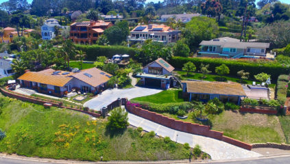 Sweeping panoramic ocean views abound from this magnificent property perched in the Muirlands on two contiguous lots with a detached guest house and an expansive view deck. All structures combine a mix of traditional and modern with the warm Old World ambiance of the wood pitched and beamed ceilings and floors and the sleek updates in the kitchen and bathrooms. The main house of 2,900 square feet offers three bedrooms, three bathrooms, an enormous family rooms, a snazzy gourmet kitchen, multiple French doors, recessed lighting and more. The one bedroom guest house is no less luxurious and is a comfortable self-sufficient space complete with a gourmet kitchen sure to impress; not to mention the spectacular ocean views. There is also a detached finished two car garage with an ocean view room above it. Set behind the gated flagstone driveway, this private and wonderful residence on a combined more than half acre double lot is a very special property.